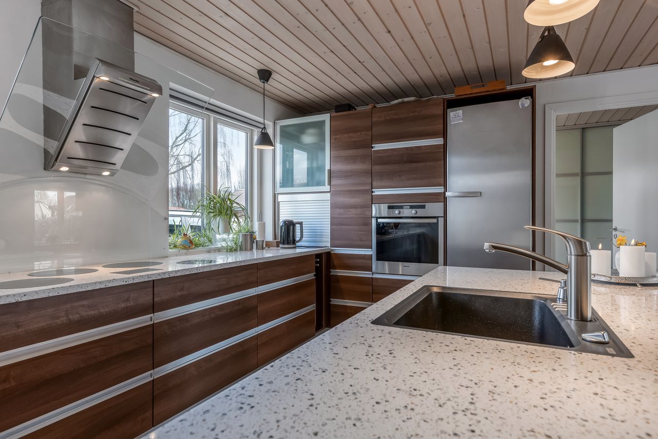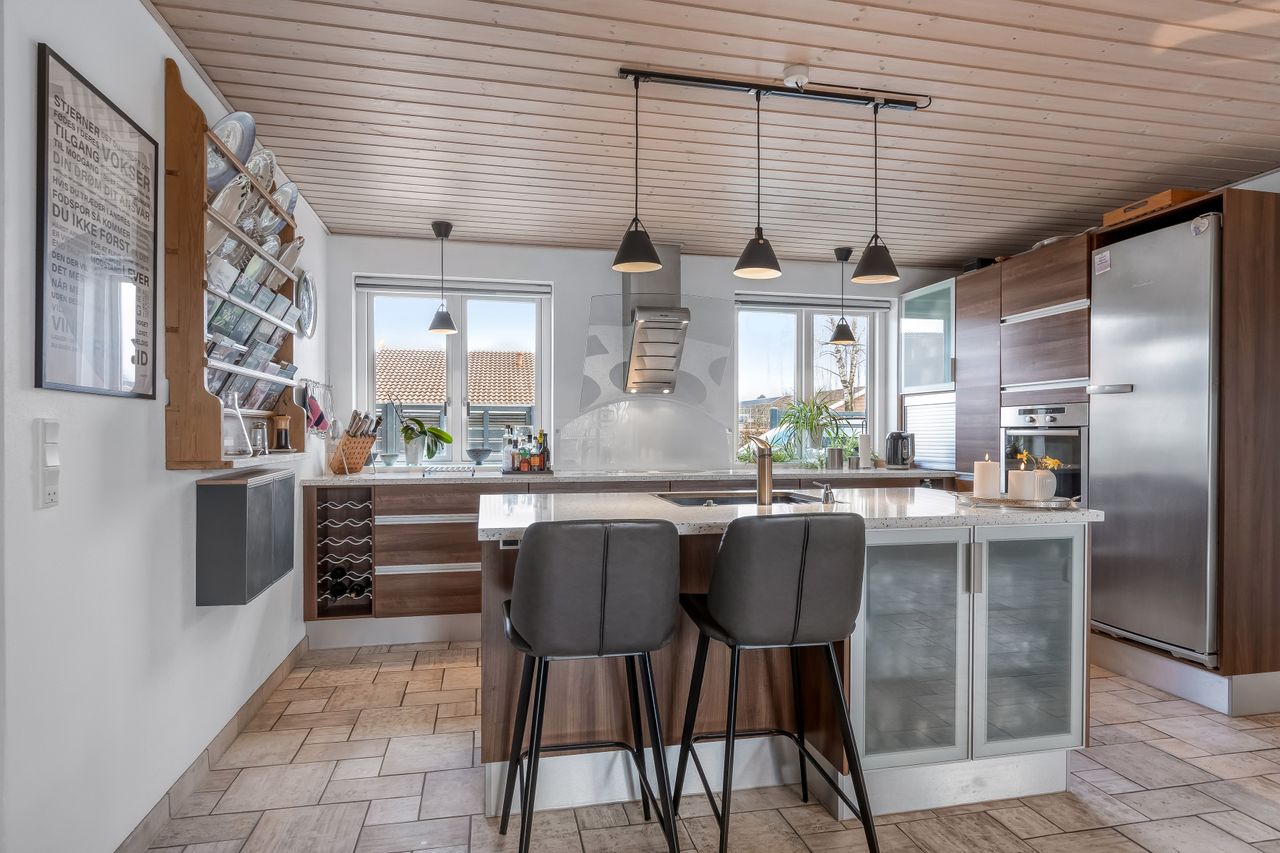 INDRETNING: Hjerterummet i denne fantastiske villa, er et lækkert stort køkken/alrum med et godt lysindfald fra begge sider. Køkkenet er flot med sine mørke fronter, og har en smuk lys granit bordplade, og ligger i åben forbindelse med alrummet samt en hyggelig mindre TV-stue, hvor børnene kan slappe af inden maden bliver serveret. Herfra er der udgang til dejlig lukket terrasse samt trappe op til 1. sal. Endvidere finder man et flot lyst badeværelse med håndvaskearrangement med støbt vask, bruseniche, lyse klinker samt gulvvarme. Fordelingsgang. Hyggelig og charmende stue (Denne kan deles i 2 rum, såfremt man mangler ekstra værelser). Værelse med skydeskabsarrangement. Flot bryggers med bord og vask, lyse låger samt lyse klinker. 1. SAL kunne være helt ideel som teenageafdeling. Her finder man 2 store værelser med udgang til altan. Repos. Lækkert stort soveværelse med walk-in. Toilet med håndvaskearrangement.