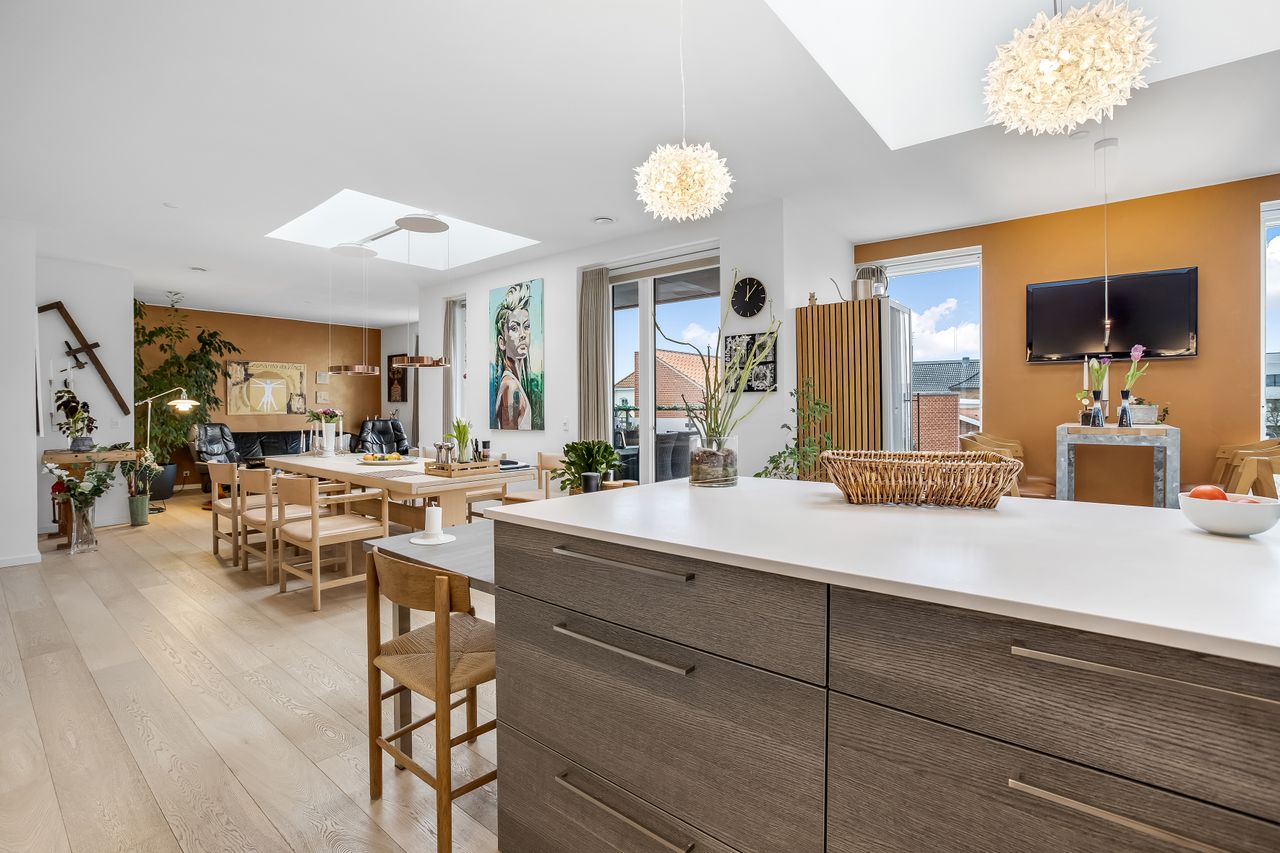 INDRETNING: Det første man møder, når man træder ind i denne smukke lejlighed, er en hyggelig entre i åben forbindelse med et helt unikt hjerterum. Et lækkert stort køkken/alrum fra Kvik i åben forbindelse til dejlig stue. Dette imponerende rum har de smukkeste lysindfald fra alle vinkler med alle dens vinduespartier samt ovenlysvinduer. Fra alrum er der udgang til en dejlig stor sydvendt altan med trægulv samt flot markise, så der også kan findes skygge. Lille fordelingsgang med adgang til gæstebadeværelse med flot håndvaskearrangement med støbt vask samt grå fronter, bruseniche og grå klinker. Lækkert stort soveværelse med skydeskabsarrangement og med direkte adgang til eget badeværelse, som er med flot håndvaskearrangement med støbt vask, grå fronter, bruseniche samt grå klinker. Endvidere byder lejligheden på et stort værelse med skydeskabsarrangement.