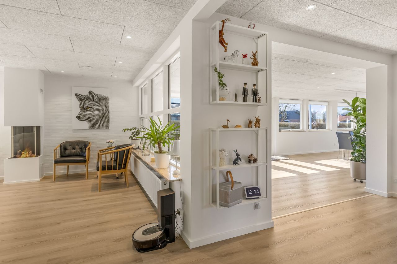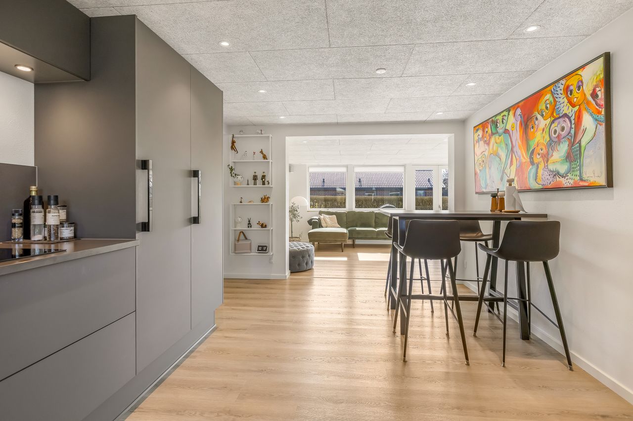 I forbindelse med den store renovering af villaen er der blevet skabt et enestående køkken/alrum, som strækker sig helt ud i den fantastiske udestue, som er blevet en fuldintegreret del af villaen i dag. Her er der gulvvarme, fuldt isoleret og dobbelt dør direkte ud til haven. Det flotte køkken er fra Tvis Køkken og her er der bestemt ikke gået på kompromis med hverken kvalitet eller detaljer. Den flotte mørke kompositbordplade passer perfekt til de lyse fronter med en væg tonet i en sart grå. Her er der bl.a. lavet en skuffe med stik til opladere, så alt er gemt væk, når det lader. en jalousilåge, der kan skjule kaffemaskine og airfryer og et flot integreret vinkøleskab. Kogepladen er en topmodel fra Bora med integreret emhætte.