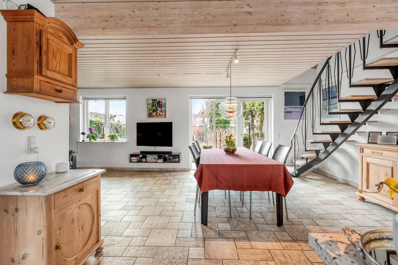 INDRETNING: Hjerterummet i denne fantastiske villa, er et lækkert stort køkken/alrum med et godt lysindfald fra begge sider. Køkkenet er flot med sine mørke fronter, og har en smuk lys granit bordplade, og ligger i åben forbindelse med alrummet samt en hyggelig mindre TV-stue, hvor børnene kan slappe af inden maden bliver serveret. Herfra er der udgang til dejlig lukket terrasse samt trappe op til 1. sal. Endvidere finder man et flot lyst badeværelse med håndvaskearrangement med støbt vask, bruseniche, lyse klinker samt gulvvarme. Fordelingsgang. Hyggelig og charmende stue (Denne kan deles i 2 rum, såfremt man mangler ekstra værelser). Værelse med skydeskabsarrangement. Flot bryggers med bord og vask, lyse låger samt lyse klinker. 1. SAL kunne være helt ideel som teenageafdeling. Her finder man 2 store værelser med udgang til altan. Repos. Lækkert stort soveværelse med walk-in. Toilet med håndvaskearrangement.