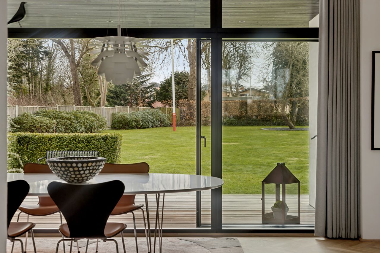 Gennem den røgfarvede glasdør åbner villaens hjerte sig: et imponerende alrum med frit udsyn til haven. Her flyder håndlagt sildebensparket i egetræ fra rum til rum – forseglet med matlak, så materialets ærlighed og varme træder tydeligt frem.