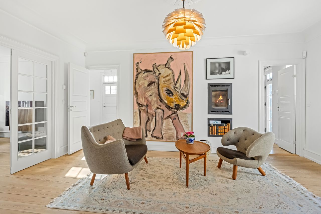 Den smukke hall med højt til loftet, en smuk svungen trappe til 1. sal og travetingulv er det første man møder i denne skønne villa. Her finder man også det flotte gæstebadeværelse med bruseniche og flot håndvaskearrangement. De to skønne stuer en suite med franske døre, højt til loftet og et skønt lysindfald fra både øst og vest komplementeres på fornemmeste vis af det originale patinerede trægulv. I den hyggelige opholdsstue er der plads til de bløde møbler og hygge foran TV, mens pejsestuen med den indbyggede brændeovnsindsats indbyder til et sjovt brætspil eller en god bog, mens flammerne knitre i baggrunden. Fra stuen er der udgang til den store sydvestvendte træterrasse og den hyggelige have. Det store lyse køkken/alrum er velindrettet med et lyst køkken med kompositbordplade og en rigtig fin spiseplads til hele familien. Derudover har man også i stueplan et stort værelse/soveværelse med direkte indgang til en et lækker badeværelse med både bruseniche og badekar - her er der naturligvis også gulvvarme.